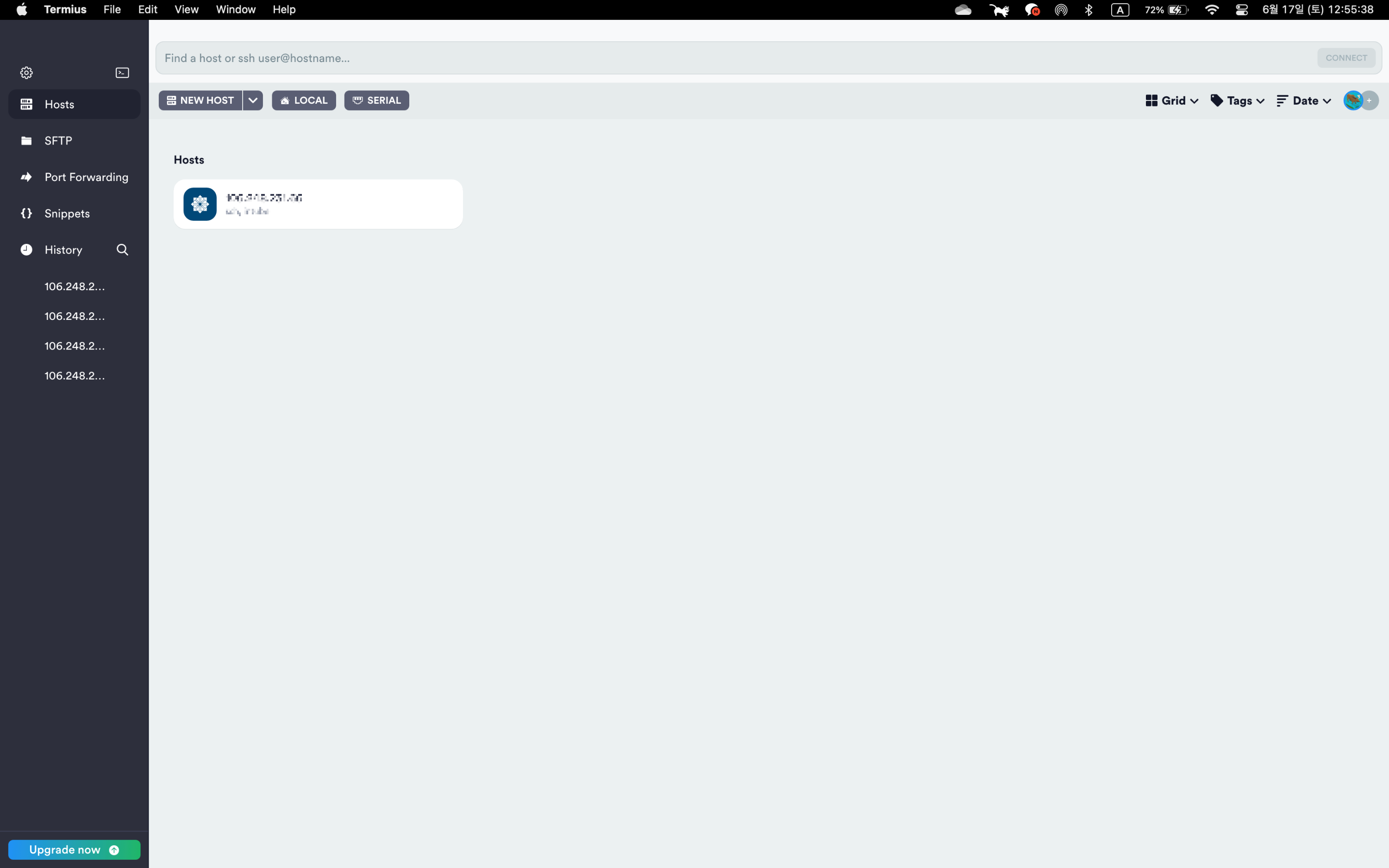 Termius 는 ssh 명령어를 사용해 특정 서버에 접속하는 것을 지원하는 것은 물론 이런 호스트 정보를 라벨과 함께 저장하여 더블 클릭만으로 원하는 서버에 접속할 수 있는 기능 역시 제공한다. 만약 접속해야 할 서버의 대수가 굉장히 많고 이들을 구분할 필요가 있다면 ‘그룹’을 추가하여 호스트 목록을 묶어서 관리할 수도 있다. 쩐다.