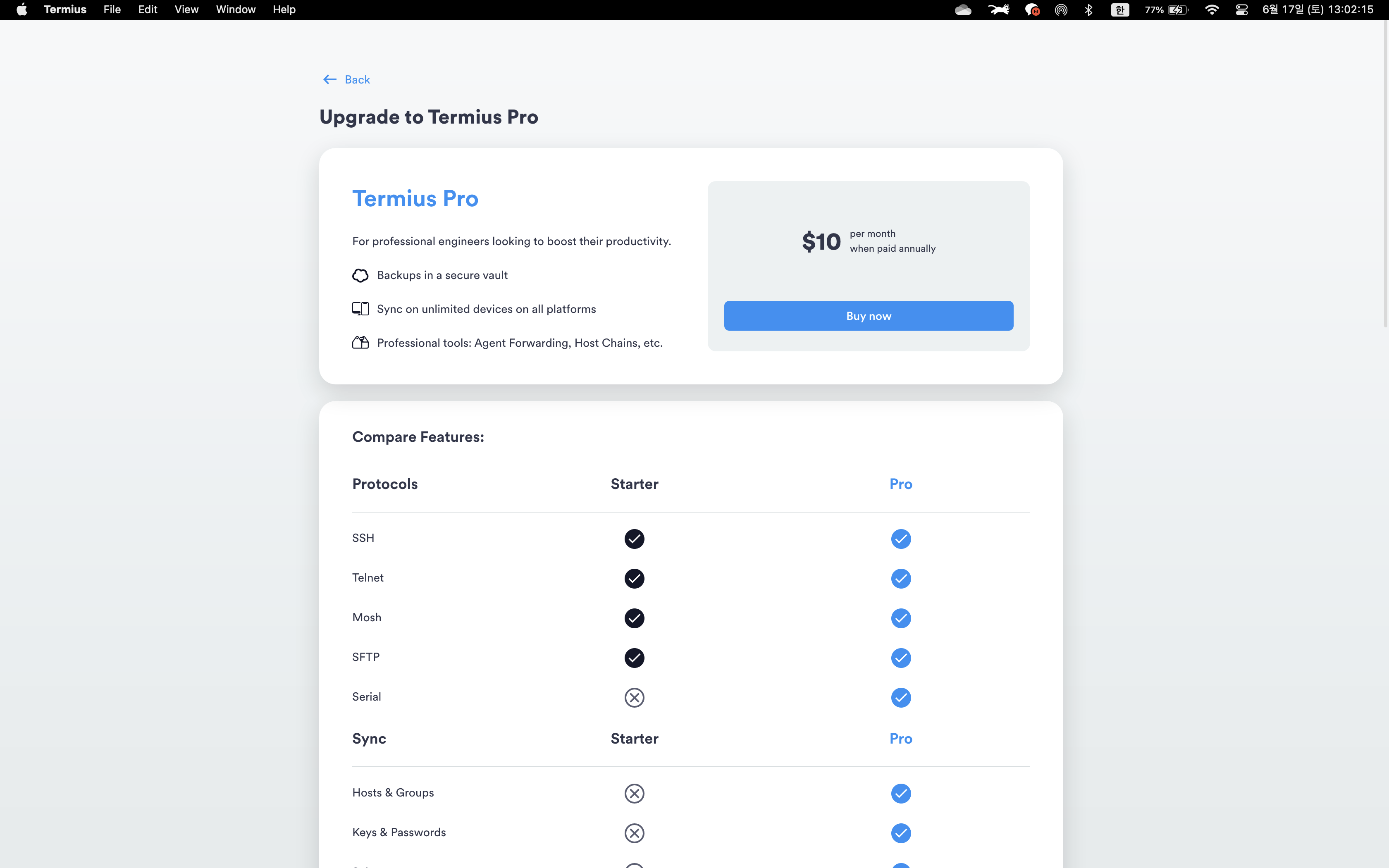 그 외에도 프리미엄 계정을 사용하면 Sync, AWS, Azure, 추가적인 Security 서비스, Snippets, Tunneling 기능이 추가된다. 나는 아직 뭐가 뭔지 모르기 때문에 Starter로 충분히 만족하고 사용하고 있지만, 고오수들은 필요한 기능이 탑재되어 있다면 월 만원에 매력적인 앱을 이용해 업무 효율성을 늘릴 수 있다고 생각이 된다.