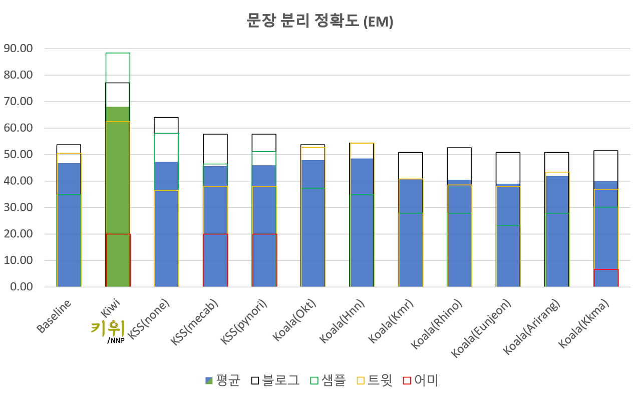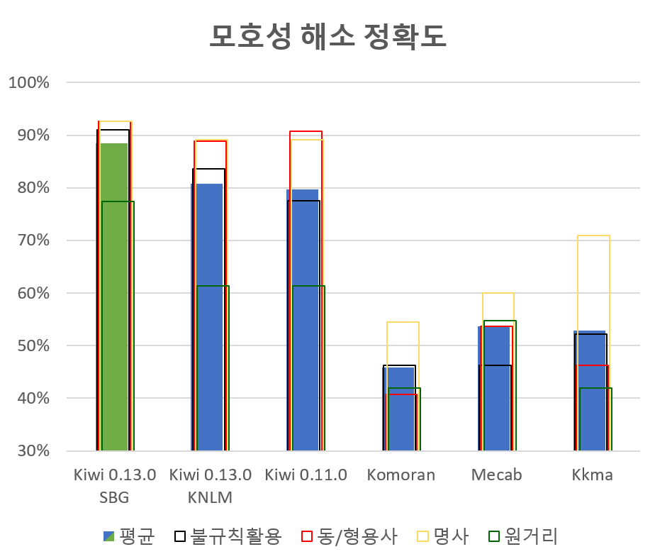 단순히 속도가 빠르다고 장땡이 아니니, 한국어 분석의 난제인 모호성 해소 정확도 그래프를 확인해보자. 속도 면에서 압도적 우위를 가졌던 Mecab이 모호성 해소 부분에서는 다소 아쉬운 성능을 보여줬다. 그러나 Kiwipiepy는 90%에 준하는 성능을 보여준다. 기본적으로 KoNLPy 라이브러리들 보다는 모호성 해소 정확도에서 좋은 성능을 보여주고 있다.